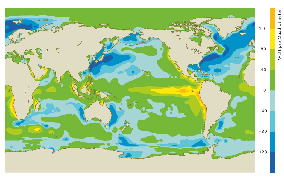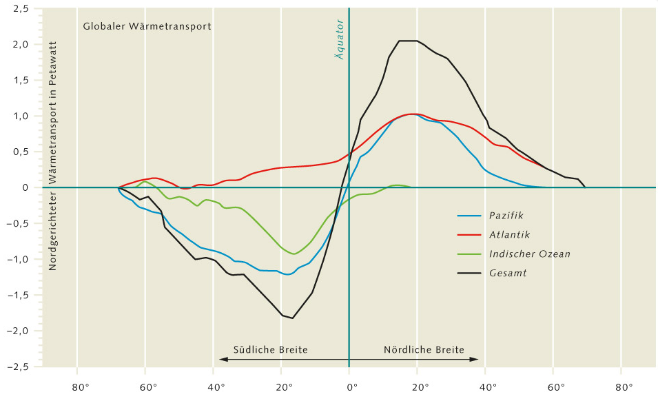 Die großen Meeresströme transportieren nicht allein riesige Wassermassen, sondern zugleich auch gigantische Wärmemengen um den Globus. So wie der Wassertank einer Heizungsanlage Wärme aus der Solaranlage auf dem Dach speichert, wirken auch die Ozeane wie ein gewaltiges Wärmereservoir, in dem die Sonnenenergie lange erhalten bleibt. Die großen Meeresströme transportieren diese Wärme über Tausende von Kilometern und beeinflussen damit erheblich, wie der Golfstrom zeigt, das Klima in vielen Regionen der Erde. In den warmen Tropen und in den Subtropen bis etwa zum 30. Breitengrad trifft im Jahresdurchschnitt mehr Wärme auf die Erdoberfläche, als diese abgibt. In den höheren Breiten und zu den Polen hin ist dieses Verhältnis umgekehrt. Die Folge ist, dass die Atmosphäre und die Ozeane zum Ausgleich Energie vom Äquator nach Norden und nach Süden transportieren. In manchen Tropenregionen wie etwa dem Ostpazifik gewinnt das Meer mehr als 100 Watt Wärme pro Quadratmeter – in etwa so viel wie ein Heizkessel liefert, um eine Wohnung behaglich zu machen. In den höheren Breiten gibt das Meer die Wärme wieder ab. Am größten ist der Verlust mit Werten von bis zu 200 Watt pro Quadratmeter vor den Ostküsten Nordamerikas und Asiens sowie in Teilen der Arktis. Im Bereich des Nordatlantiks und des Nordpazifiks geben die Ozeane die Wärme durchaus großräumig ab. Versorgt werden all jene Regionen, in die die großen Stromsysteme das warme Wasser tragen – etwa Europa. Die riesigen Meeresströme transportieren eine maximale Wärmemenge von knapp 3 Petawatt (Billiarde Watt) in Richtung Norden – rund 600-mal mehr, als alle Kraftwerke der Welt zusammen leisten. Aber auch die Atmosphäre trägt zum Energieausgleich zwischen den Tropen und den kälteren, höheren Breiten bei. Sie transportiert weitere 2,5 bis 3 Petawatt Wärme, sodass sich ein nordgerichteter Wärmetransport von insgesamt 5,5 bis 6 Petawatt ergibt. In der Atmosphäre erfolgt der Wärmetransport in europäischen Breiten vor allem durch kreisende Tiefdruckgebiete. Im Atlantischen Ozean sind die Strömungen hingegen sehr viel geordneter, sodass die Wärme direkt nach Norden transportiert wird. Dort strömt warmes Wasser aus den Tropen nordwärts bis weit in den Arktischen Ozean, wo sich das Wasser abkühlt und Wärme an die Umgebung abgibt. Durch die Abkühlung nimmt die Dichte des Meerwassers zu. Es sinkt in die Tiefe und wandert gen Süden. Das atlantische Stromsystem transportiert demnach riesige Mengen Wärme nach Norden. Bei diesem Transport übersteigt der thermohaline den durch die Winde angetriebenen Anteil bei Weitem. Der Atlantik und auch der Pazifik tragen jeweils etwa 1 Petawatt Wärme aus den Tropen und Subtropen in nördliche Richtung. Der Anteil des Indischen Ozeans hingegen ist vernachlässigbar gering.